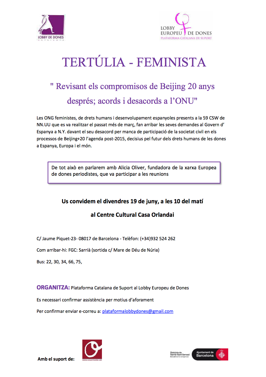 TERTÚLIA – FEMINISTA Juny 16, 2015Juny 16, 2015 ~ plataformalobby ~ Deixa un comentari Descarrega’t el pdf amb tota la informació clicant aquí. Tertulia ONU